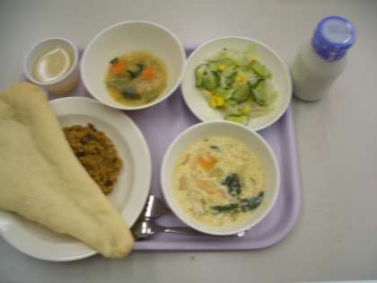 今日の献立は、ドライカレーサンド、牛乳、チーズのふわふわスープ、コーン入りフレンチサラダ、リンゴゼリーです。今日もアレルギー対応食を作ってくれました。