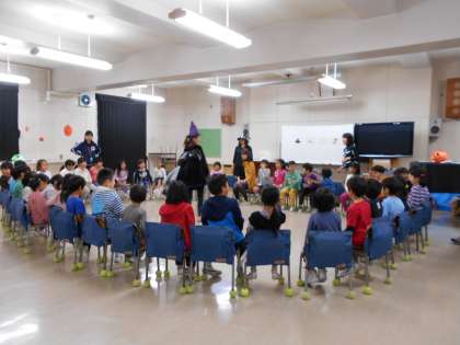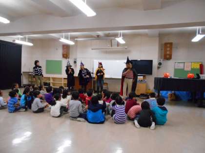 1年生が国際理解教育の一環として、大田区立池雪小学校の英語ボランティアのお母さま方のご協力をいただき、ハロウィン・パーティーの活動に取り組みました。おばけやかぼちゃなどの英単語を教えてもらい、歌やゲームを楽しみました。