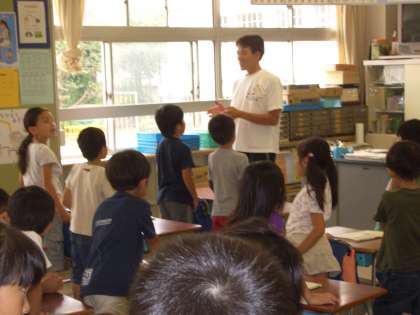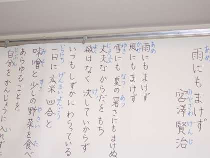 1年生の教室では、宮澤賢治作「雨ニモマケズ」の詩の学習をしていました。午後の授業でも1年生は、担任の先生のリードで一生懸命学習していました。覚えている子どももたくさんいました。