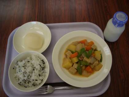 今日の献立は、わかめごはん、牛乳、肉じゃがうま煮、くだものです。