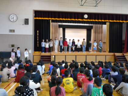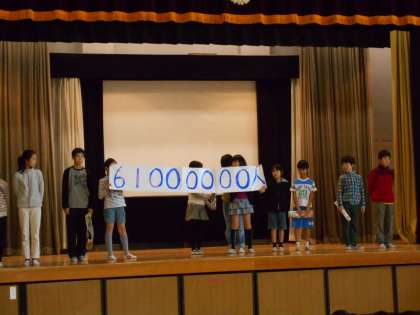 来週のユニセフ募金(12/9〜12/13)に先立ち、代表委員の子どもたちが募金の意味をわかりやすく伝えました。