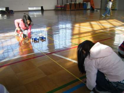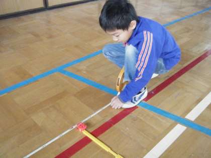 自動車がすすんだ距離を、算数の「長さ」で学習した巻き尺を使って測りました。