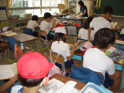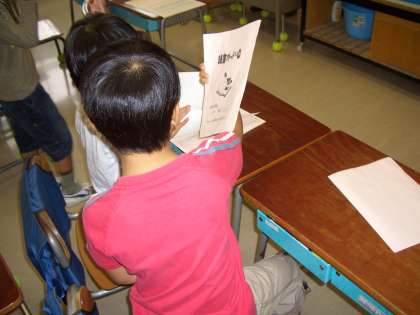 さて、1年生の教室−“朝読書タイム”を終えて、“読書ノート”に読んだ本を記録していました。友達と確認し合っていました。