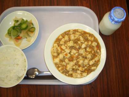 今日の献立は、ご飯、牛乳、麻婆豆腐、シャキシャキ野菜です。