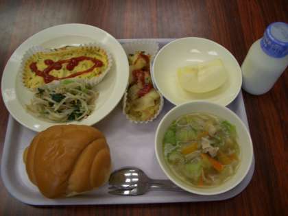 今日の献立は、バタールパン、牛乳、スペイン風オムレツ、青菜のソテー、レタススープ、くだものです。