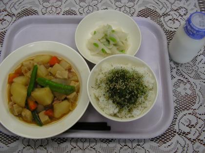 今日のメニューは、ごはん、ふりかけ、肉じゃがうま煮、かぶの甘酢かけ、牛乳です。