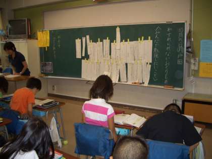 3年生の教室では、「国語科」“わすれられない おくりもの”という教材を子どもたちにどうのうようなことを学びたいか・・・カードに書き、めあてをもって学習を進めていました。
