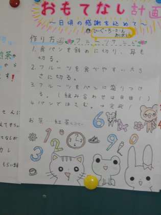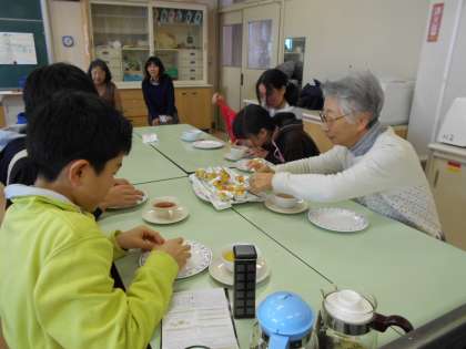 6年生は、米作り・ミシン学習・戦争体験と地域の方にたくさん教えていただきました。今日はお世話になった皆さんをティーパーティーにお招きしました。