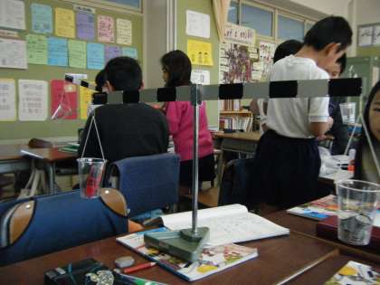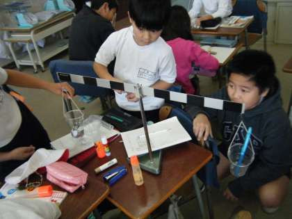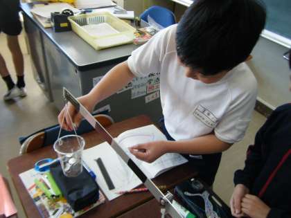 「重さを数字で表すと分かりやすい」という子どもの意見から、ちょうど1gの一円玉を使って量りました。一枚一枚、一円玉を数えて量り、実感の伴った学習になりました。