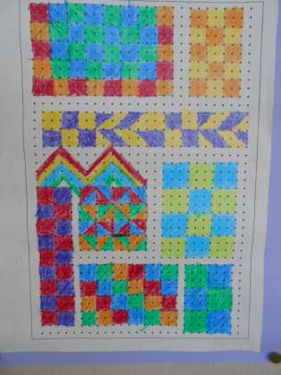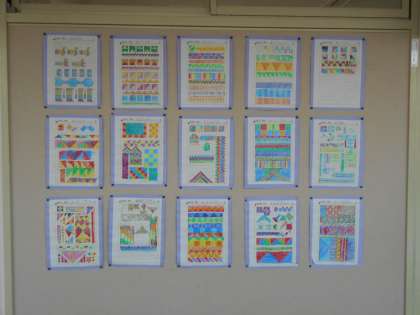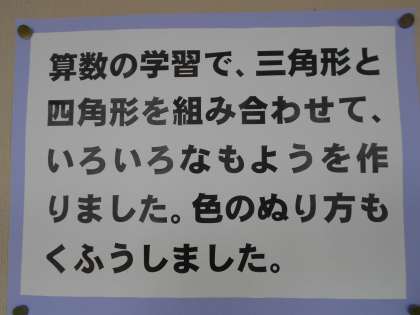 2年生は、算数で三角形や四角形の学習をしました。形を組み合わせ素敵な模様をつくりました。