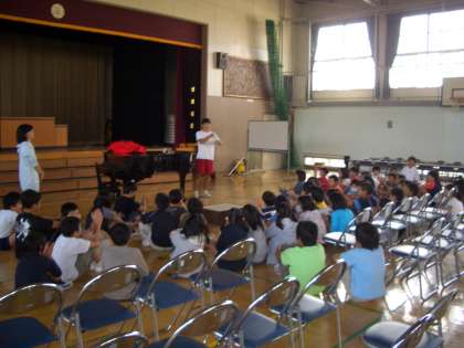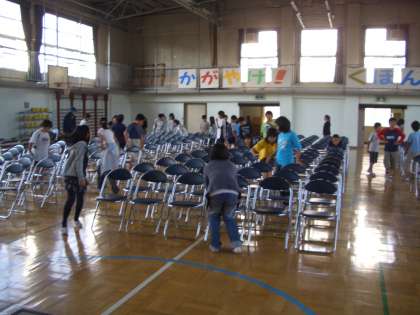今日の昼休みに、研究発表会場となる体育館の準備を担任の先生の指揮のもと、高学年(5、6年生)が行いました。清掃をしたり、椅子をならべたり、体育用具を舞台奥に片づけたりしました。どの子どもも進んで作業していました。