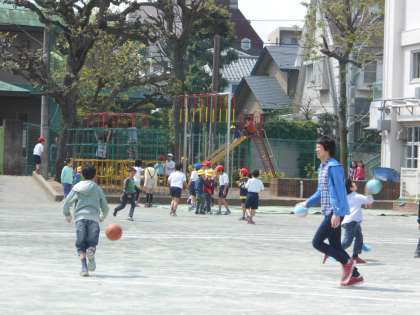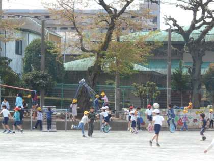 今日、1年生を迎える会があり、休み時間はみんなで外遊びをしました。