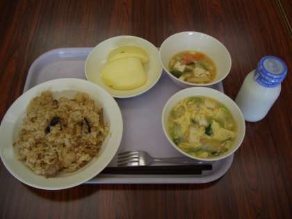 今日の献立は、中華おこわ、牛乳、中華風コーンスープ、くだものです。今日もアレルギー対応食を調理員さんが作ってくれました。