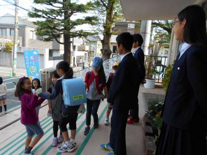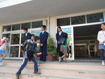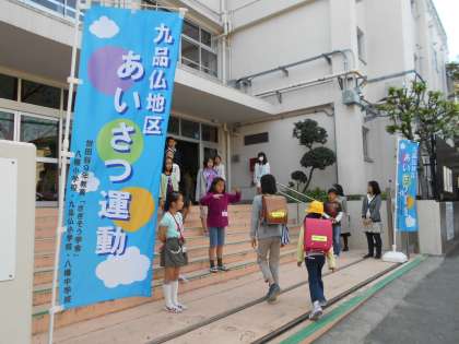 毎日、代表委員や担当の学年が玄関で「あいさつマン」として、元気よく声をかけています。時々、八幡中学の生徒会のみなさんも参加してくれます。