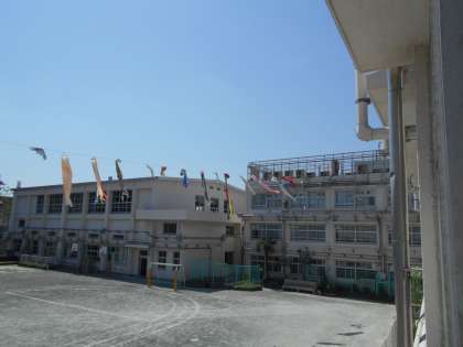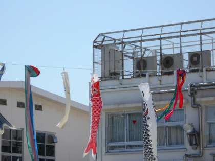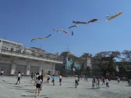 校庭にたくさんのこいのぼりが気持ちよさそうに泳いでいます。