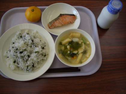 今日の献立は、わかめごはん、牛乳、魚の塩焼き、みそ汁、くだものです。