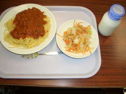 今日の献立は、スパゲティミートソース、牛乳、ジャガイモのハニーサラダです。