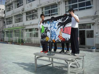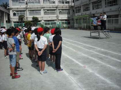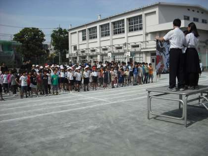 今日の児童朝会に八幡中学校の生徒会が、5月24日(土)に行われる中学校の運動会をアピールのために来てくれました。小学生の徒競走のプログラムもあるそうです。