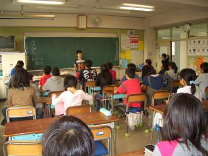 6年生は、「朝の会」での“1分間スピーチ”です。男の子が、“連合運動会”でがんばったことを話していました。