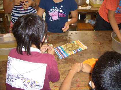 木の繊維をたたいてから、繊維についている小さな木の屑もていねいとる過程へ・・・・・そして、最後は、紙をすいていきます。うまくできるといいと思います。