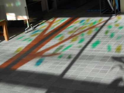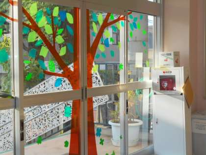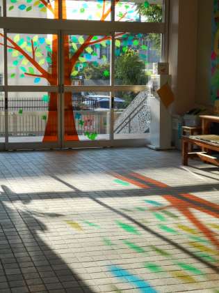 玄関の子どもたちがつくったステンドに西日が差しこみました。とてもきれいです。