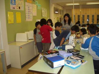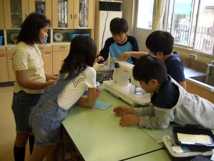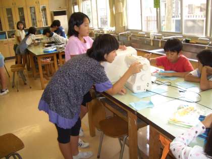 5年生は家庭科室で、“エプロン作り:ミシンの使い方”の学習をしていました。グループの仲間が協力し合って取り組んいました。