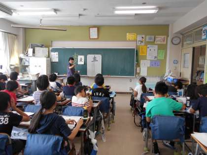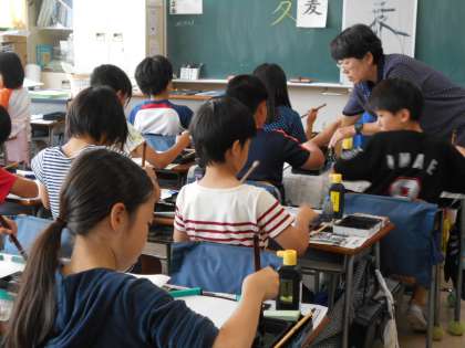 4年生の習字は、講師の渡邉先生が担当しています。一筆一筆、丁寧に運ぶことを指導していました。
