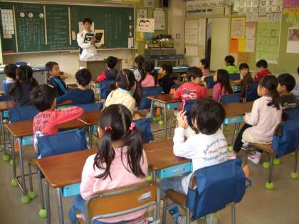 2年生の教室では、「宿題のプリントの答え合わせ」をしていました。1年生から続けているので、係りの子どもを中心に自分のプリントの答え合わせをしてから、裏の漢字練習を隣りの友達と交換して、正しくていねいに書いてある“字”には、丸をつけていました。