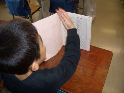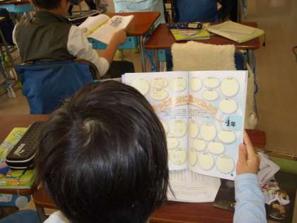 1年生の教室では、先生から、「10月の一カ月に何冊くらい本を読めたかな?」と言われて、自分の読書カードを見て、調べているところです。画面の子どもは、A4の読書カードの1ページに“読んだ印”がつていました。