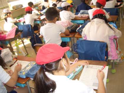 2年生の教室では、1時間目の「体育の授業です。」体育着に着替えてから、主題の算数と漢字のプリントの答え合わせなどをしていました。