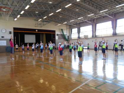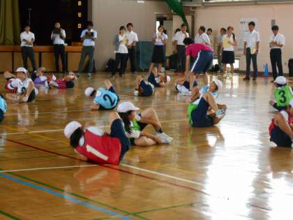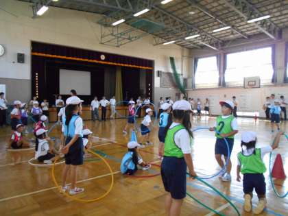 3年生の体育はボールやフラフープを使って、楽しく体を動かす学習に取り組んでいます。どうしたら上手にできるかを互いに教え合っていました。