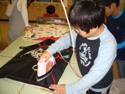 5年生は、家庭科“エプロン作り”今まで、ミシンのかかけかたなどで、ゲストテーチャ—に保護者や地域の方々の協力をいただき、作成してきました。今日は、アイロンかけをして完成に近づきました。・・・4・5年生の作品は、展覧会に展示されます。