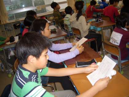 6年生は、国語科です。昨日までに書いた“要約文”を読み返していました。画面の児童は、たくさんの丸をもらっていました。