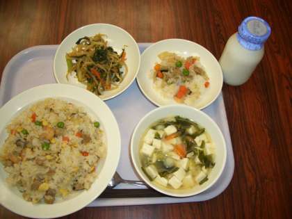 今日の献立は、チャーハン、牛乳、わかめスープ、炒めナムルです。