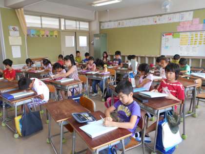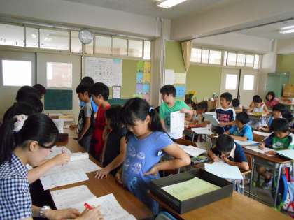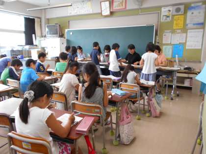 2〜5年生の補習教室も今日から7月30日までの予定で始まりました。教員の他、八幡中学の生徒、大学生、地域の方が丸付けをしてくださいます。