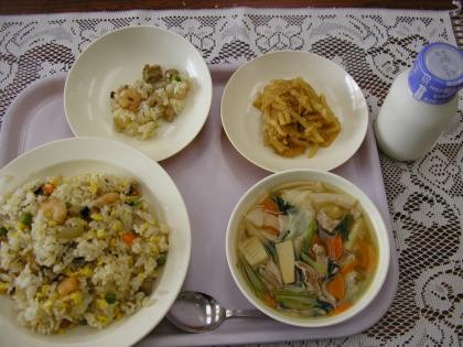 今日のメニューは、チャーハン、ワンタンスープ、大根の中華味、牛乳です。