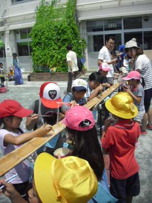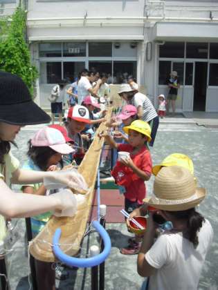 晴天の校庭でBOP主催の流しそうめんが行われました。