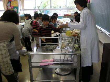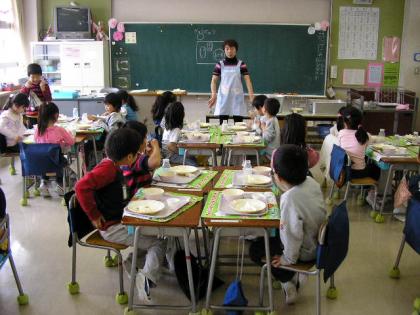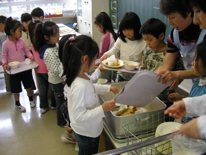 今日から一年生の給食が始まりました。一人ずつ順番に並んでお盆を持ち、当番の子から給食をもらいました。小学校での初めての給食、みんなで食べるとおいしいね。