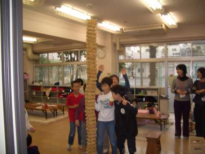外は雨で今日は、“内うち遊び”・・・BOPの部屋を通りかかったら、3年生の子どもたちと職員の方々で、“塔”を建てていました。協力しながら、倒れないように積み重ねていき、天井まであとひといきでした。
