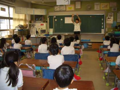1年生の教室では、朝の会を利用して、“体育科:ボールあて・ボールとりゲーム”の説明をゆっくりと分かりすくしていました。ボールの苦手な子どもも楽しくできるような配慮です。