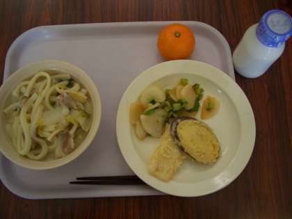 今日の献立は、みそ煮込みうどん、牛乳、てんぷら、かぶのレモンしょうゆかけ、くだものです。