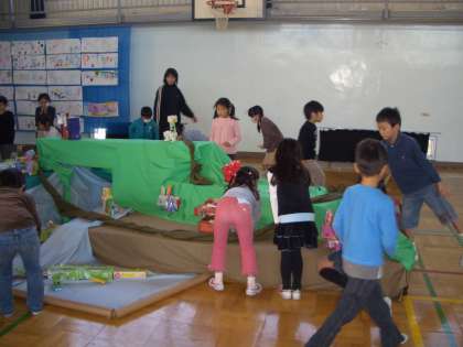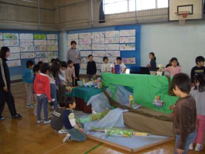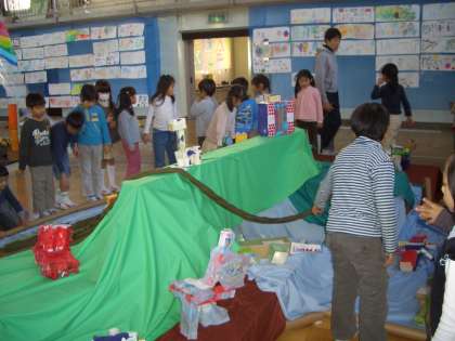 1年生は、“帰りの会”が終わってから、展覧会場に行き、自分の立体作品に名前をつけに行きました。先生の説明を受けてから、自分の作品に名前をつけました。