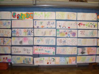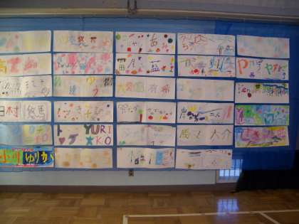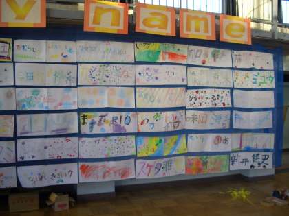 会場入り口には、全校児童がアイディアをだした“自分の名前のデザイン”が展示してります。