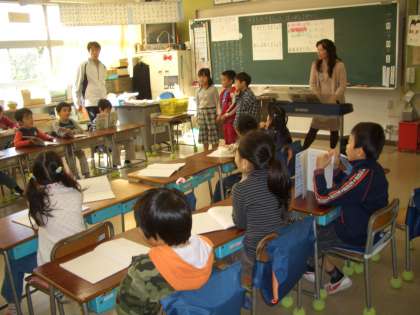 1年生は、「音楽科」“手をたたきましょう”の歌を子どもたちから聞いた言葉を入れて、動作をつけながら、順番に発表していました。