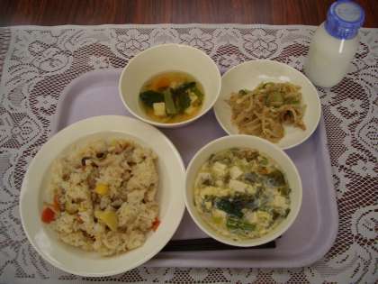 今日の献立は、吹き寄せごはん、牛乳、かきたま汁、ごま酢かけです。今日もアレルギー対応食を調理さんが作ってくれました。