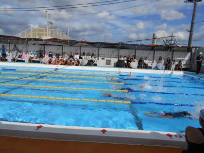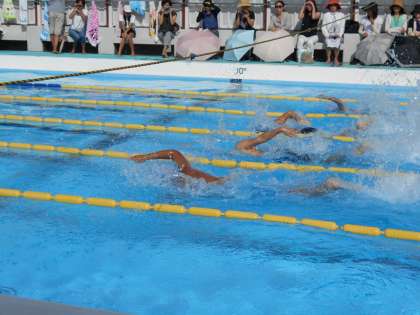 さぎそう学舎の八幡小学校と九品仏小学校の合同の水泳記録会が、真夏の太陽が照りつける中、行われました。友だちや保護者の声援を受けて、力いっぱい泳ぎ切りました。