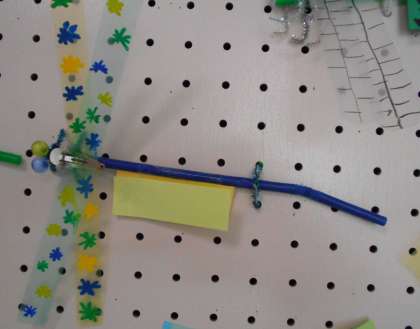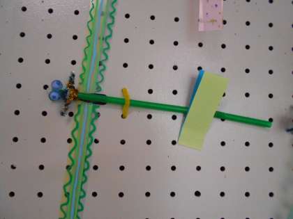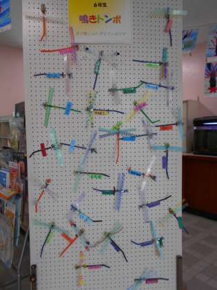 6年生の「息で鳴く不思議なとんぼ」が、玄関ギャラリーに飛んできました。
