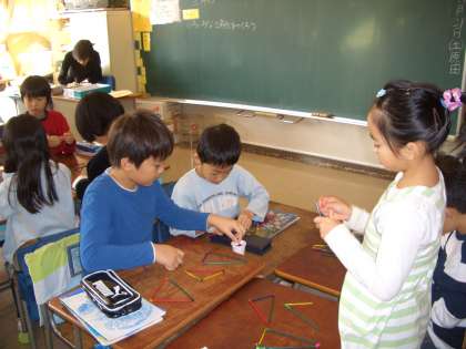 3年生は、1時間目の授業“算数科:少人数指導”担任の先生の授業です。“三角形”の学習で、いろいろな三角形をグループで相談しながら作っていました。