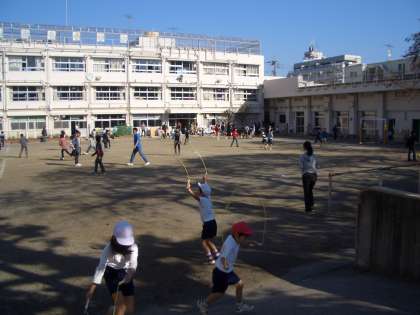 休み時間は、なわとび、ドッチボール、バスケットボール、一輪車、鉄棒遊び、めちゃぶつけ等など・・・遊びを工夫して校庭いっぱいに広がって遊んでいました。
