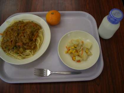 今日の献立は、スパゲティ カレーソース、牛乳、ポテト入りフレンチサラダ、くだものです。